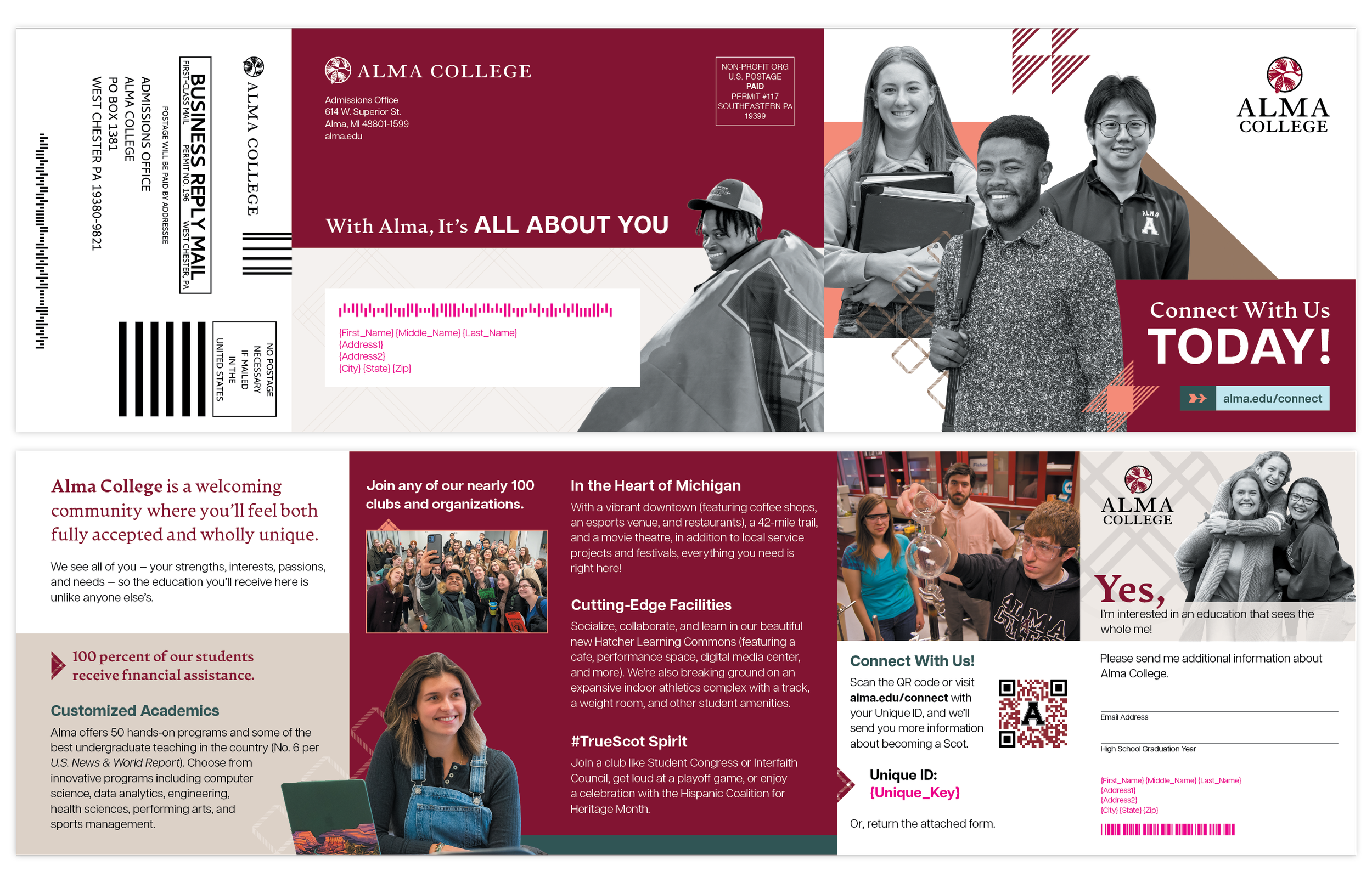 Initial Interest Piece: Designed a visually engaging print piece to capture the attention of prospective students, showcasing the unique offerings of Alma College and driving initial engagement.
